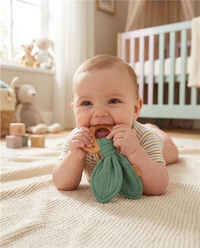 De bijtring met muslin doek is de ideale set wanneer de tandjes van uw baby doorkomen. De bijtring is gemaakt van beukenhout dat vriendelijk is voor het milieu en zachte muslin stof. Volledig veilig voor kinderen biedt het verzachtende verlichting tijdens het doorkomen van de tandjes. De bijtring kan ook worden gebruikt als speelgoed voor baby's. De bijtring past perfect bij onze andere muslin producten en vormt zo een prachtige set die als cadeau gegeven kan worden op een babyshower.