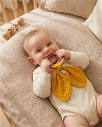 De bijtring met muslin doek is de ideale set wanneer de tandjes van de baby doorkomen. De bijtring is gemaakt van beukenhout dat vriendelijk is voor het milieu en zachte muslin stof. Volledig veilig voor baby's biedt het troostende verlichting tijdens het doorkomen van tandjes. De bijtring kan ook als speelgoed voor baby’s worden gebruikt. De bijtring past perfect bij onze andere muslin producten en creëert zo een mooie set die als cadeau voor een babyfeestje kan worden gegeven.