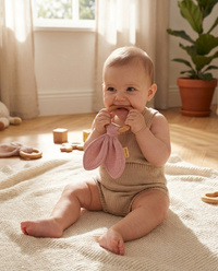 De bijtring met muslin doek is de ideale set wanneer de tandjes van de baby doorkomen. De bijtring is gemaakt van beukenhout dat vriendelijk is voor het milieu en zachte muslin stof. Volledig veilig voor baby's biedt het troostende verlichting tijdens het doorkomen van tandjes. De bijtring kan ook als speelgoed voor baby’s worden gebruikt. De bijtring past perfect bij onze andere muslin producten en creëert zo een mooie set die als cadeau voor een babyfeestje kan worden gegeven.