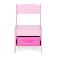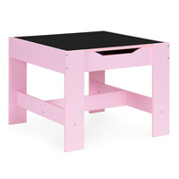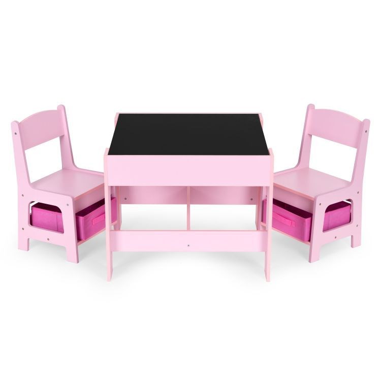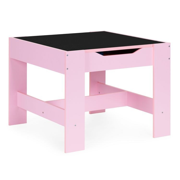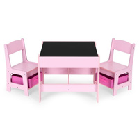 De set bestaat uit 2 stoelen en een tafel. Het meubel heeft een duurzame en stabiele constructie van MDF. De tafel is uitgerust met een dubbele, omhaalbare blad, waarvan één zijde dient als krijtbord. Onder het blad bevindt zich een praktische opbergruimte voor blokken, speelgoed of andere kleine spullen. Onder de zittingen van de stoelen bevinden zich ruime textielen lades die geschikt zijn voor het opbergen van speelgoed. De set is ideaal voor de kinderkamer, speelkamers of wachtkamers.