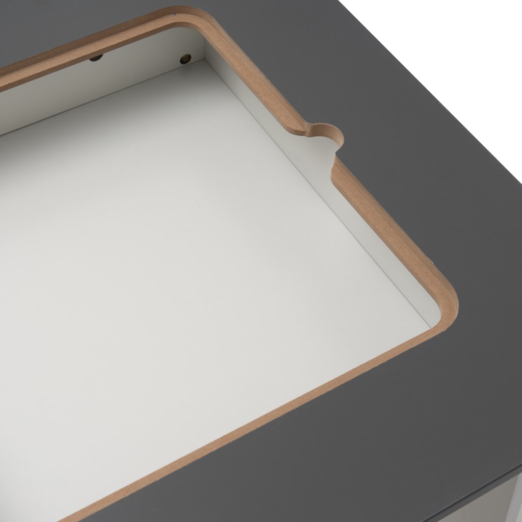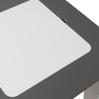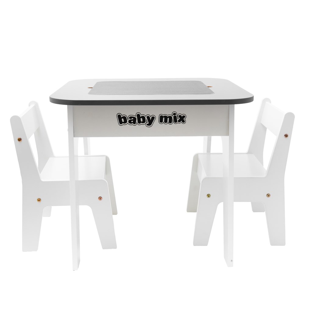 De set bestaat uit een tafel met twee stoelen, vervaardigd uit duurzaam materiaal dat stabiliteit en een lange levensduur garandeert. De tafel is voorzien van een praktische afneembare tafelblad – daaronder bevindt zich een opbergruimte waar kleurpotloden, papier, kleine speeltjes of bouwsets gemakkelijk kunnen worden opgeborgen. Kinderen hebben zo altijd de benodigde spullen bij de hand en houden tegelijkertijd alles netjes.