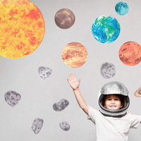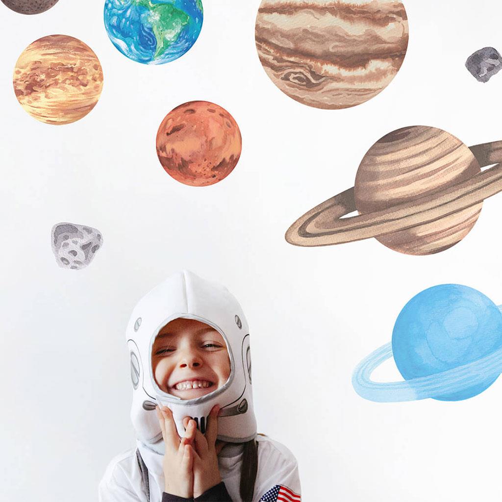 Prachtige wandsticker Zonnestelsel S. De stickers van het zonnestelsel zijn een geweldige manier om een buitenaards ruimte-thema toe te voegen aan de kinderkamer. De set bevat 8 planeten: Mercurius, Venus, Aarde, Mars, Jupiter, Saturnus, Uranus en Neptunus. De set bevat ook de zon, de maan en verschillende asteroïden.