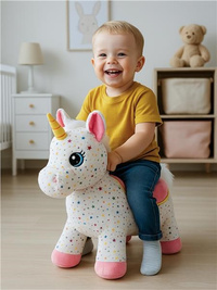 Het pluche opblaasbare springpaard zorgt voor langdurig plezier voor uw kind. Tijdens het springen versterkt uw kind zijn benen, leert het bewegingen coördineren en stabiliteit behouden. Het springpaard kan comfortabel aan de oren worden vastgehouden en bevat een geluidsmodule die, bij het indrukken tussen de oren, een realistisch paardengeluid produceert. Het is bedekt met een pluche materiaal dat prettig aanvoelt en niet glijdt. De verpakking bevat een pomp voor een gemakkelijke oppomp van het paard en batterijen (3xLR44).