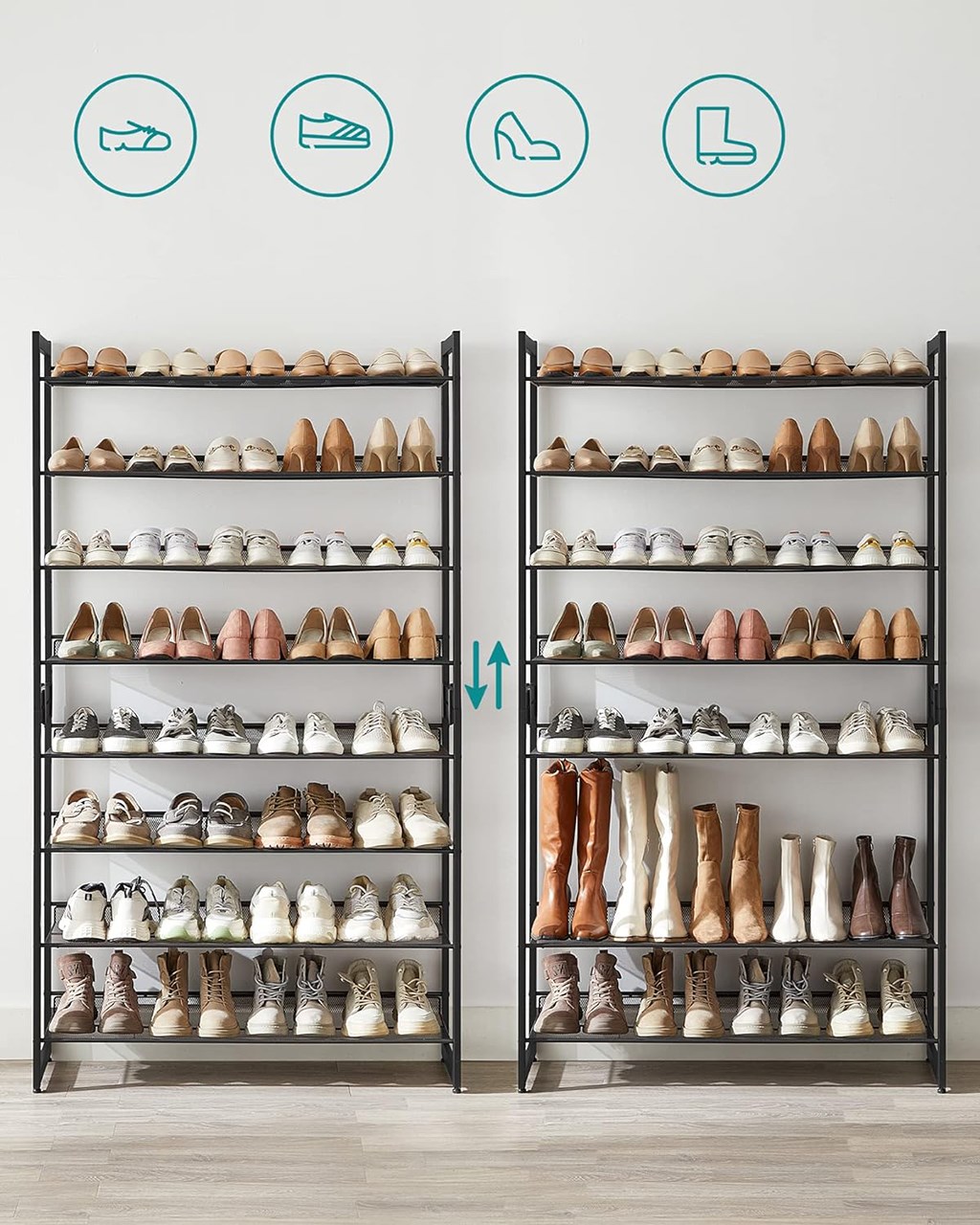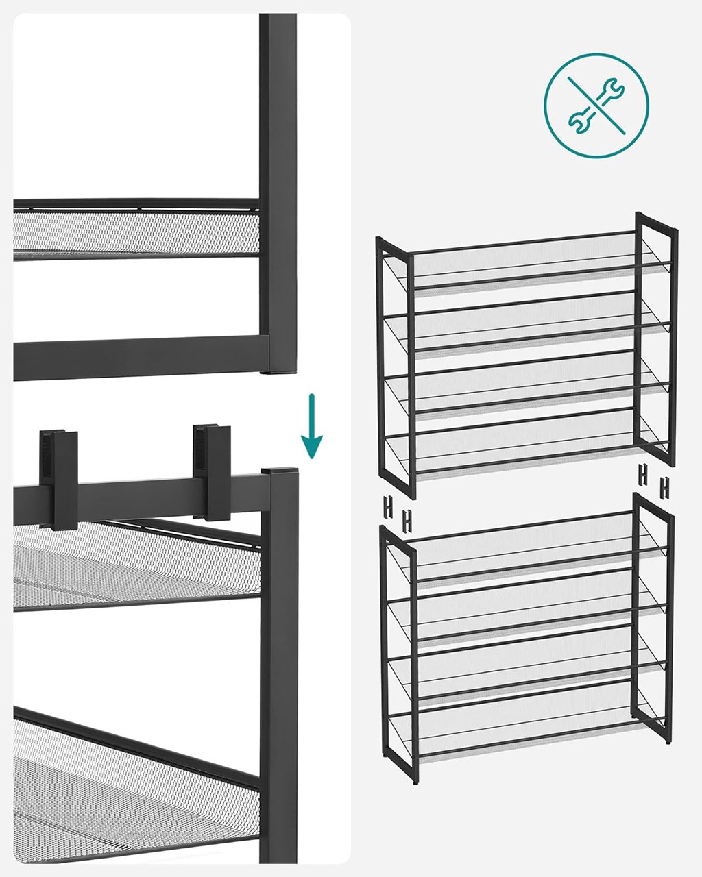 De planken in de vorm van metalen roosters zijn praktisch voor zowel volwassen als kinder schoenen – inclusief de kleinste.
