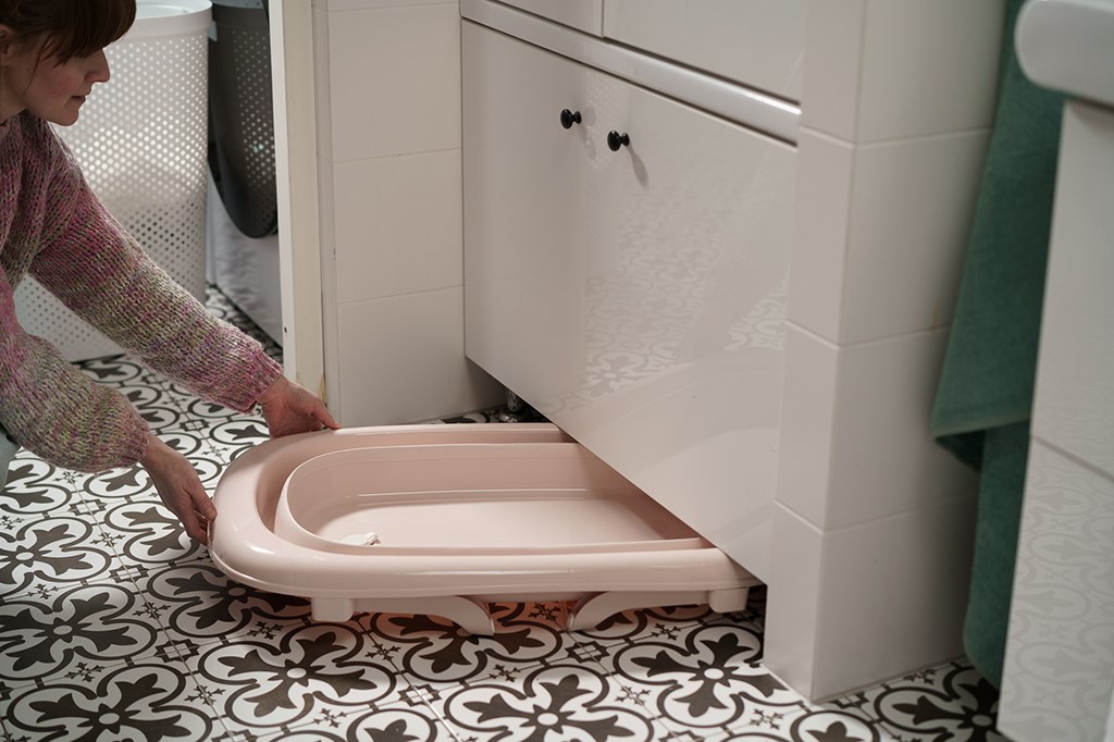 Het badje is uitgerust met een afvoerventiel en een bandthermometer, wat het comfort en de veiligheid bij dagelijks gebruik aanzienlijk verhoogt. Het kan eenvoudig tot een hoogte van slechts 10 cm worden opgevouwen, terwijl de kunststof poten direct onder het badje klappen – waardoor het minimaal ruimte in beslag neemt en ideaal is voor opslag, zelfs in kleinere ruimtes.