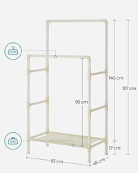 De ijzeren constructie zorgt voor de stabiliteit van het meubel, waardoor het het hele jaar door ideaal is – vooral in de winter, wanneer je zware jassen en jacks eraan hangt. Er is ook ruimte op de stangen voor feestelijk gestreken overhemden en jurken.